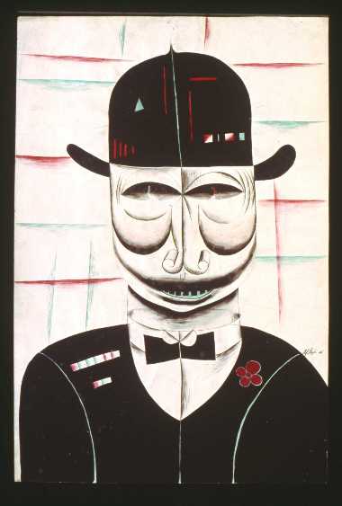 Which is a way of introducing my discussion of Clifford Bayliss¹ "Man Wearing a Bowler Hat", which seems to me fearsome, remarkably sinister, and ferociously humorous. In a face reduced to stylised sweeps and curves, the mouth is a metallic grille, and the eyesockets are replaced by a bleak desolate landscape. It is as though we can look into this man¹s eyes and see the empty lifeless vista that is his internal world, and that reflects back to us the awful emptiness of the external world he has known. Campaign ribbons and a red poppy indicate this man has seen active service, and we note that the painting is dated 1945. It seems that this may be a comment on the horrors seen in a world at war. For me, the melancholic humorous note is struck by the bowler hat, which is a deliberate borrowing from the Belgian surrealist, Magritte, who used it in his own art as a "fright stopper". For Magritte, the hat was a stopper, a plug, that sat on his head to hold in (as a plug stops the water) the frightened feelings that troubled him. Surely the hat serves a similar function for Bayliss enabling him to provide us with a deadpan humdrum image that contains an appalled recognition of terrible realities.