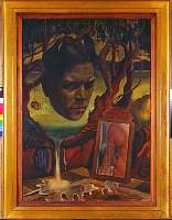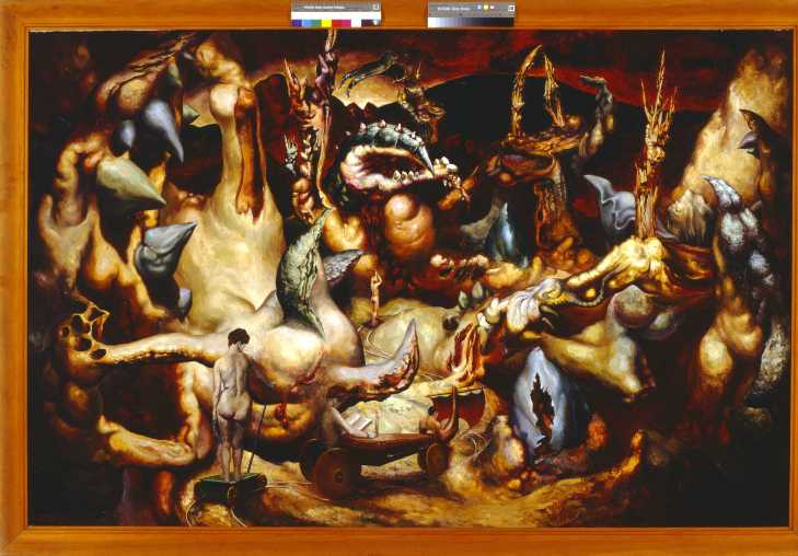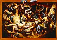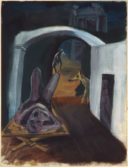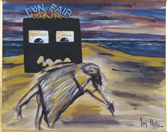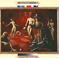 Some of the works we see here can be examined from this perspective. At the core of the traumatic experience is a sense of loss, particularly of loss of the beloved protector who one needs desperately to be present and available. Representation of the experience in art may set up a resonance which responds to that loss. Look at Klaus Friedeberger¹s "Camp Dream". (Friedeberger was interned in Australia in the 1940s.) A camp inmate, utterly alone in the night howls on his camp stretcher, with his mouth echoing Munch¹s "Scream". He is enclosed in a claustrophobic space, whose exit is patrolled by dangerous looking beasts. A sketchy structure in the background seems to offer no hope of escape. And in an alcove/doorway on the right we can see a figure of uncertain gender that lurks, looking on.