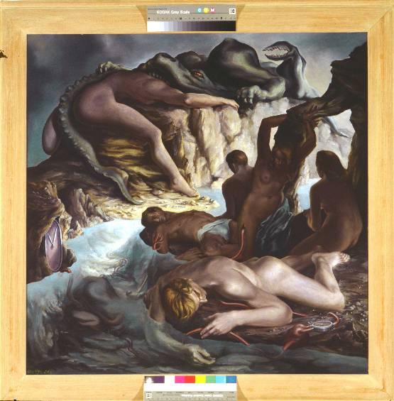 The artists want to let us know as much as they are able to know of their internal emotional response to their chosen theme, as it has been revealed to them in their dreams, their introspection, and emotional responses. I take it that this is in fact the working definition of surrealism:- that the artist has attempted to heighten the external worldly reality of a theme or image by adding to them the reality of images drawn from his internal world. They invite us to join them in contemplating the imagery of their internal world This is why these particular works make such a powerful emotional impression on us. Perhaps this also explains why the imagery has an air of vague familiarity (to me, at least). I could speculate that there is some sort of shared language of the unconscious which may cause a shock or stirring of recognition when we see these images. After all we all share the same beginnings the experience of mothers and breasts and milk and evacuations and all that paraphernalia. These are images we all share in our emotional world, and we may recognise them intuitively. Someone said to me of McClintock¹s "Approximate Portrait in a Drawing Room" : "That¹s a bleeding vagina under his head." And it was at once recognisable to me as such and it was immediately familiar and shocking. We probably all know such imagery in our dreams, whether we remember it or not.