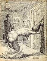 The same bowler-hatted figure appears in another ambiguous and frightening drawing by Bayliss: "Nude with Hair Caught in a Door." Is he a participant in a sexual scene here, or is he an observer? (A classic way of describing the role of the analyst in relating to the patient is as "participant-observer" both participating in an ongoing emotional relationship, and yet at the same time standing back as an observer. The artist seems to me to have cleverly caught something of this ambiguity.) And the female figure: is she submitting passively, or is she struggling in fear? The work is taken into the surreal, away from mere titillation, by the weird intrusion of an animal (cat? dog?) through a vulval-like slit in the wall. The spectator is left feeling uneasy are we being invited to join complicitly in an enactment of a sleazy fantasy, or are we merely to observe do we struggle, or do we submit to the skill of the artist¹s portrayal of the scene? Again, noting the date as 1945, there is also a possibility of considering the image as an allegory of war.